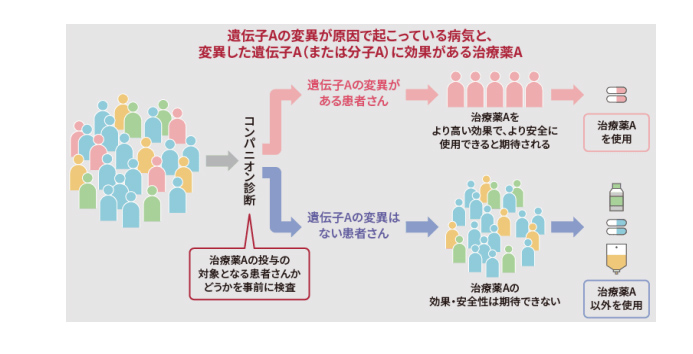 この「ゲノム医療」では、がん組織の遺伝子変異に基づいて薬剤を選択します。がんは遺伝 子に傷が付いて変異することが原因となる病気です。最近の遺伝子解析技術の進歩によっ てどのような遺伝子に変異が起きているのかを網羅的に調べることができ、その遺伝子変 異に適切に作用する薬剤があれば、より副作用の少ない効果的な治療が可能になります。 遺伝子変異を解析する検査には、「遺伝子パネル検査」と「コンパニオン診断」とがあります。